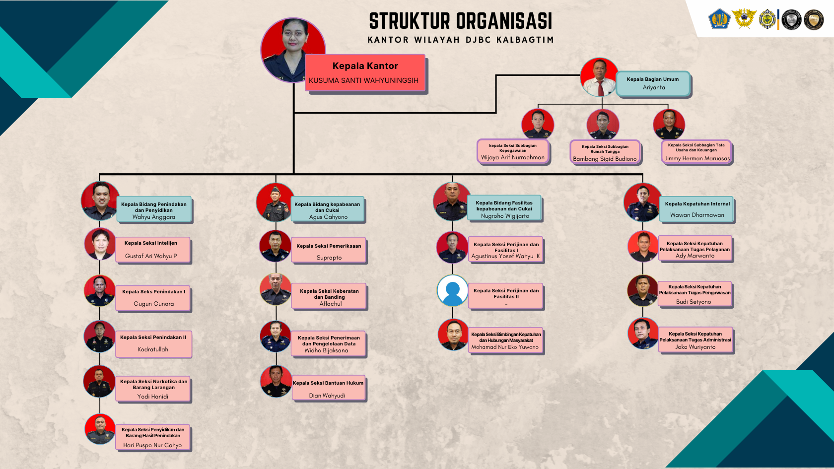 Laporan Harta Kekayaan Penyelenggara Negara (LHKPN)Kepala Kantor Wilayah DJBC Kalimantan Bagain Timur Kusuma Santi Wahyuningsih Kelapa Bagian Umum Ariyanta Kepala Bidang Penindakan dan Penyidikan Junanto Kurniawan Kepala Bidang Kepabeanan dan Cukai Agus Cahyono Kepala Bidang Fasilitas Kepabeanan dan Cukai Nugroho Wigijarto Kepala Bidang Kepatuhan Internal I Wayan Sapta Dharma Kepala KPPBC TMP B Balikpapan Raden Muhamad Agus Ekawidjaja Kepala KPPBC TMP B Samarinda Nurtjahjo Budidananto Kepala KPPBC TMP C Bontang Tri Haryono Suhud Kepala KPPBC TMP C Sangatta Wahyu Anggara Kepala KPPBC TMP B Tarakan Johan Pandores Kepala KPPBC TMP C Nunukan Danang Seno Bintoro |